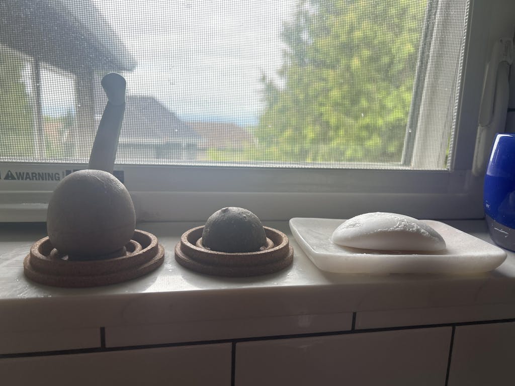 Place your stone on a soap dish with good drainage during daily use. Avoid leaving it in standing water or spraying water directly on it, as this can make the stone mushy. It’s best to let it air dry between washes. We’re excited to soon offer a unique vessel designed especially for storage!